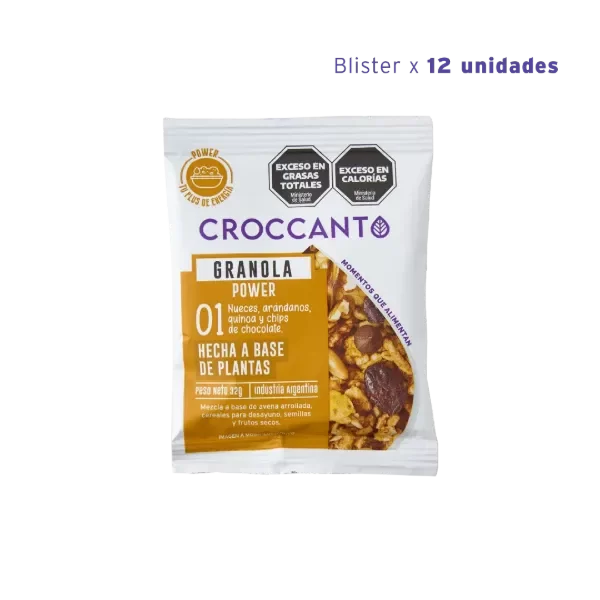 Ingredientes: Avena arrollada, maní, semillas de girasol, melaza de caña, copos de maíz laminado, nueces, pasta de maní, salvado en tiras, semillas de lino, quinoa inflada, salvado de avena, aceite de girasol alto oleico, azúcar mascabo, pasas de arándanos, baño de repostería semiamargo, fibra de achicoria y esencia de vainilla. CONTIENE: AVENA, MANÍ, NUECES, SULFITOS Y DERIVADOS DE SOJA, CEBADA Y TRIGO. PUEDE CONTENER: ALMENDRAS.