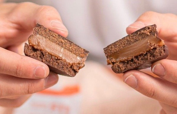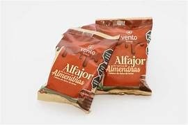 Alfajor VENTO con harina de almendras relleno con dulce de leche con baño de reposteria semiamargo sin azúcar agregada por 53grs.
