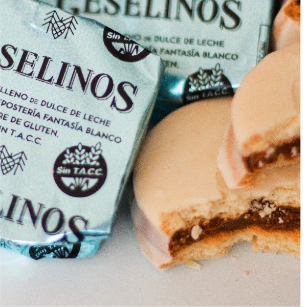 Ingredientes: dulce de leche, almidón de maíz, harina de arroz, baño de repostería fantasía blanco, almidón de mandioca, huevo líquido, leche en polvo descremada, azúcar, manteca, sal (cloruro de sodio), esencia de vainilla. Contiene leche y huevo