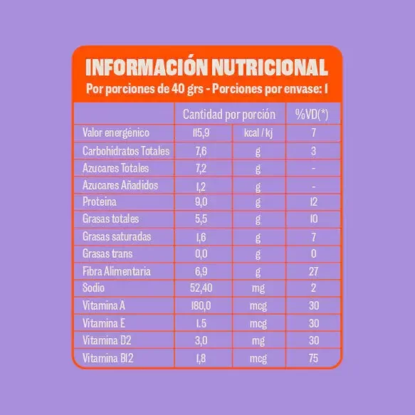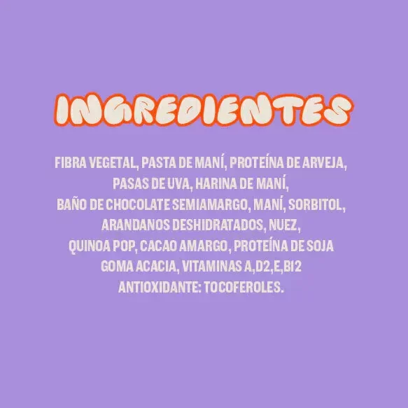 Ingredientes: Fibra Vegetal, Pasta de Maní, Proteina de Arveja, Pasas de Uva, Harina de Maní, Baño de chocolate semiamargo, Maní, Sorbitol, Arándanos deshidratados, Nuez, Quinoa Pop, Cacao Amargo, Proteína de soja, Goma Acacia, Vitaminas A, E, D2 y B12. Antioxidante: Tecoferoles.