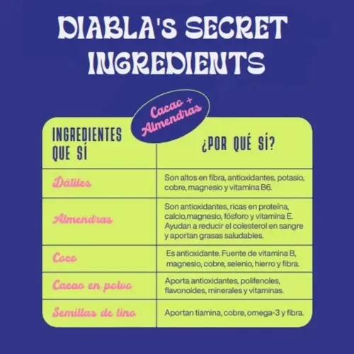 Las barritas Diabla Super Bar están elaboradas a base de dátiles, lo que les aporta un dulzor natural sin necesidad de agregar azúcares procesados. Son una opción práctica y saludable para quienes buscan un snack nutritivo. Además, son libres de gluten y contienen un mix de vitaminas, lo que las convierte en una buena alternativa para complementar la alimentación diaria, especialmente en momentos de actividad o entre comidas. Gracias a su perfil natural y su buen aporte energético, son ideales para quienes prefieren productos simples, pero bien pensados.