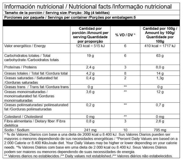 INGREDIENTES: Harina de trigo enriquecida según Ley 25630 (harina, hierro 30 mg/kg, ácido fólico 2,2 mg/kg, vitamina B1 6,3 mg/kg, vitamina B2 1,3 mg/kg, niacina 13,0 mg/kg); aceite alto oleico; sal; azúcar; ARO: provoleta y orégano; EMU: INS 322; AC REG: INS 500 ii; FLO: E223.
