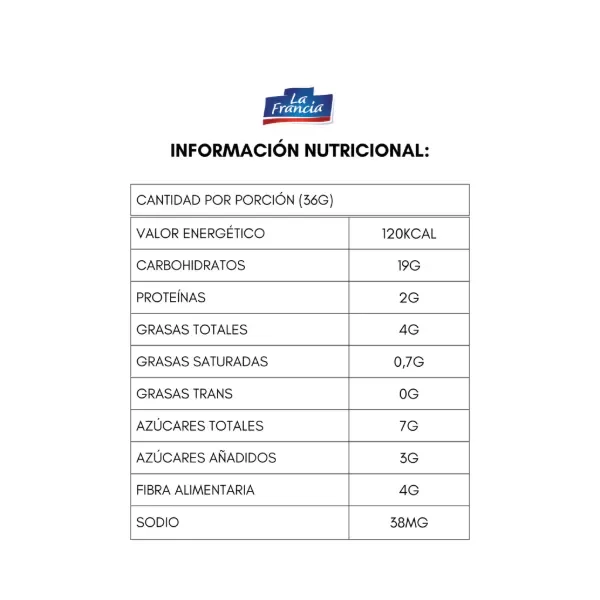 Harina de algarroba, harina integral, harina 000 enriquecida según Ley 25.630 (Hierro 30mg/kg; Ácido fólico 2.2mg/kg; Tiamina 6.3mg/kg; Riboflavina 1.3mg/kg; Niacina 13mg/kg), agua, margarina, dulce de membrillo, azúcar, avena, semillas de lino, huevo en polvo, leudantes químicos INS 500ii, INS 450ii, CONS. INS 282. Contiene huevos, avena y derivados de trigo. Puede contener maní.